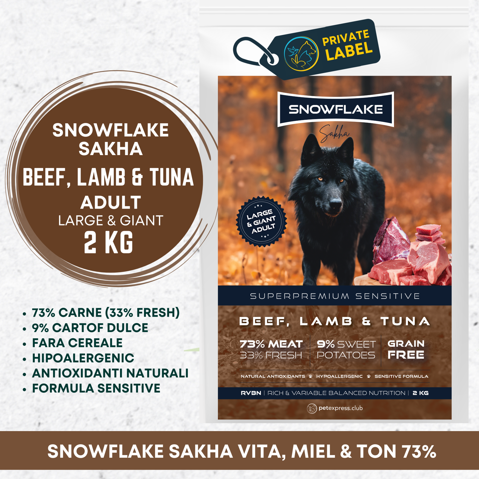 Compozitie: Carne de vită 45% (vită proaspătà 30%, vită deshidratată 10%, făină de carne de vità 5%), miel 18% (miel deshidratat 15%, miel proaspăt 3%), ton 10%. Legume de casă (proaspete, uscate, extract) - Cartofi dulci 9%, morcovi, rosii, mazäre verde, spanac verde. Grăsime de pasăre, pulpã de sfeclă uscată, ulei de somon (3%), fulgi de păstârnac. Fructe de casă (proaspete, uscate, extract de fructe) - mere, pere, prune, merisoare, afine, struguri rosii. Drojdie de bere uscată, seminte de in, ulei de floarea soarelui, ouă intregi, extracte din plante uscate (rozmarin, calendula, busuioc), ceai verde, extracte de caise, Yucca schidigera 125mg/kg, condroitina, glucozamina.