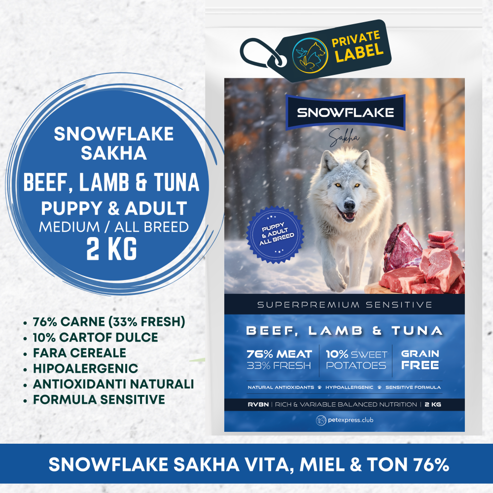 Compozitie: Carne de vita 50% (vita proaspata 30%, vita deshidratata 10%, faina de vita 10%), miel 18% (miel deshidratat 15%, miel proaspat 3%), ton 8%. Legume de casa (proaspete, uscate, extract) - cartofi dulci 10%, morcovi, rosii, mazare verde, spanac verde. Grasime de pasare, pulpa de sfecla uscata, ulei de somon (3%), fulgi de pastarnac. Fructe de casa (proaspete, uscate, extract de fructe) - mere, pere, prune, merisoare, afine, struguri rosii. Drojdie de bere uscata, seminte de in, ulei de floarea soarelui, oua intregi, extracte din plante uscate (rozmarin, calendula, busuioc), ceai verde, extracte de caise, yucca, schidigera 125mg/kg, condroitina, glucozamina.